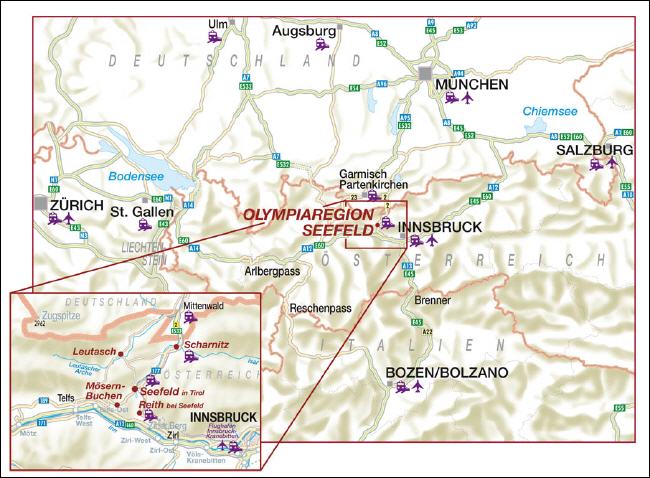 Von Norden: Über Garmisch Partenkirchen gelangen Sie nach Mittenwald und passieren die ehemalige Grenze. Schon bald sind Sie in Scharnitz, dem Tor zur Olympiaregion Seefeld angelangt (vignettenfrei). Strecke von Garmisch nach Scharnitz: ca. 35 km.
